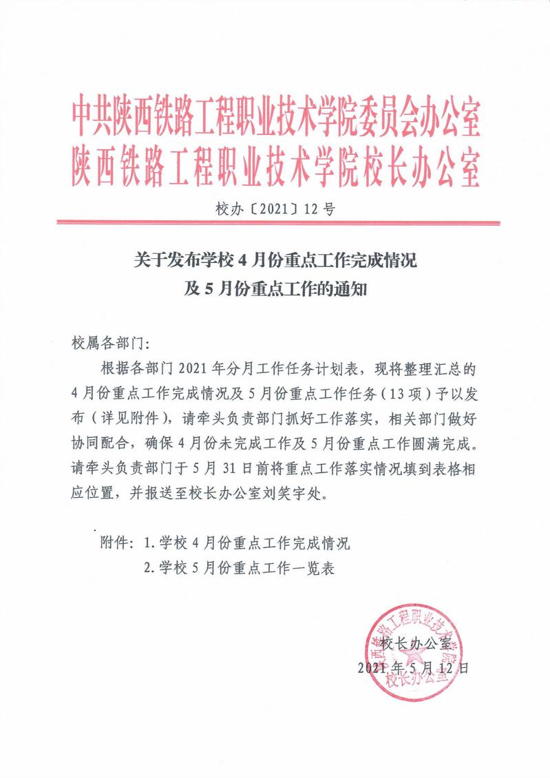 关于发布学校4月份重点工作完成情况及5月份重点工作的通知