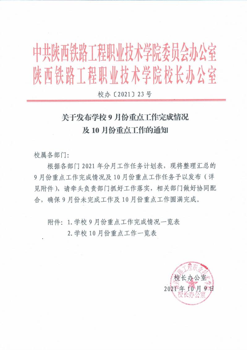 关于发布学校9月份重点工作完成情况及10月份重点工作的通知