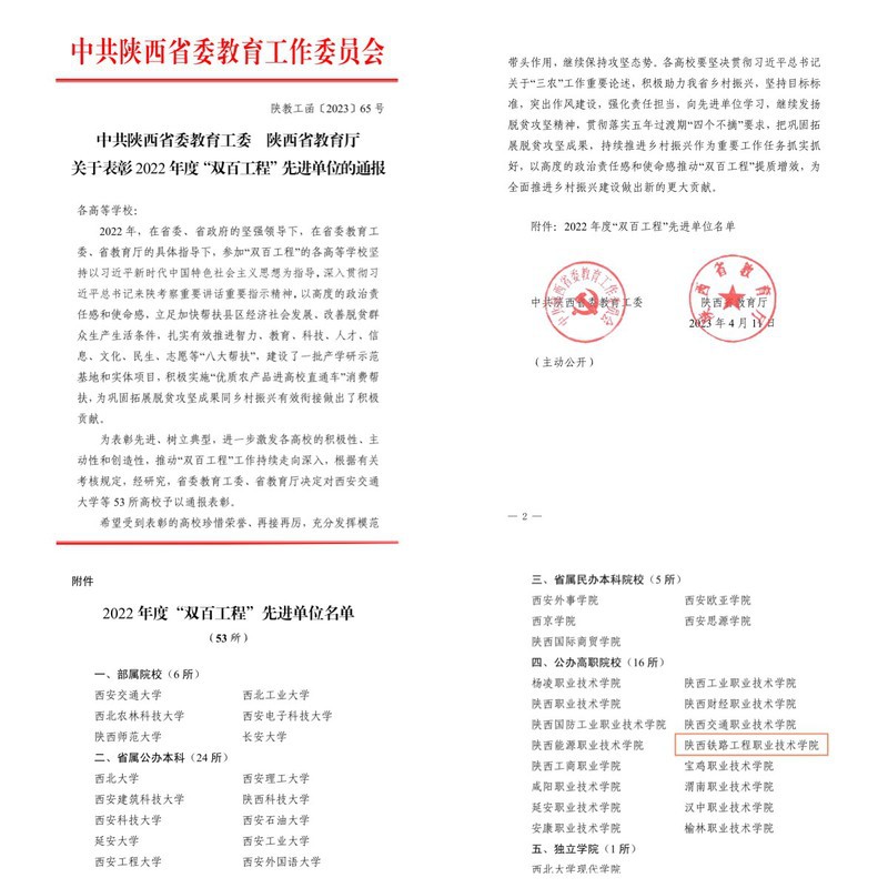 4月11日,中共陕西省委教育工委、陕西省教育厅印发了《关于表彰2022年度“双百工程”先进单位的通报》(陕教工函〔2023〕65号)文件,对全省2022年度“双百工程”先进单位进行了通报表彰。学校连续六年获得全省“双百工程”先进单位荣誉称号。全省各高等院校接受了省委教育工委、省教育厅2022年度“双百工程”工作考核,共有53所高校受到通报表彰,其中公办高职院校16所。
