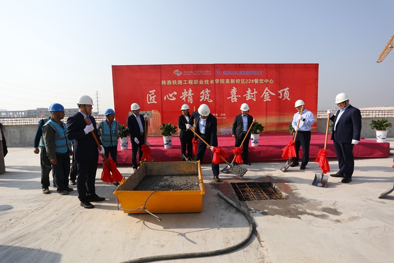 8时58分,各位领导和来宾移步主席台正中,焦胜军宣布:陕西铁路工程职业技术学院22#楼封顶浇筑现在开始。现场领导、嘉宾同执金锹,共同浇筑最后一块混凝土,22#餐饮中心荣耀封顶。标志着22#餐饮中心项目的建设迈入全新阶段。