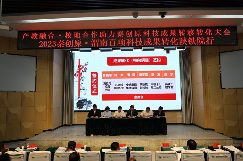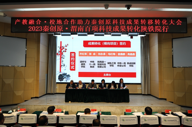在过去的一年,学校科技成果转化、技术培训等秦创原建设工作逐步发展,先后承接技术服务共73项,合同额累计2254.4万,技能培训252万,合同额连续两年突破2000万元。会议举行了成果转化仪式,副校长张学钢及高铁工程学院、测绘与检测学院、城轨工程学院、道桥与建筑学院、铁成(创新)学院负责人分别与6家企业进行了横向课题项目签约。