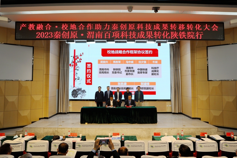 为深入贯彻全国教育大会精神,落实《陕西省教育厅办公室2023年推进高校深度融入秦创原建设工作要点》《陕西省深化全面创新改革试验推广科技成果转化“三项改革”试点经验实施方案》等文件精神,推动创新生态加速优化、创新资源加速聚集、创新成果加速转化,进一步加强校地、校企协同发展,6月2日上午,产教融合·校地合作 助力秦创原科技成果转移转化——2023秦创原·渭南百项科技成果转化陕铁院行大会在学校博爱厅召开,本次大会由渭南市科学技术局与学校联合主办,西安交通大学国家技术转移中心渭南分中心协办。大会旨在聚焦内涵发展,打造技术技能创新服务新高地,全面扎实推进学校深度融入秦创原创新驱动平台建设。渭南市委常委、副市长马中威,中国铁建首席专家、中国铁建高原隧道施工技术及装备研发中心主任任少强,陕西省教育厅科学技术处处长朱晓冬,陕西省科技厅科技成果处副处长牛斌,渭南市科学技术局党组书记、局长武俊兴,渭南师范学院学院副院长卢爱刚,渭南职业技术学院副院长王韦华,学校党委书记焦胜军等政企校领导及教师代表近300人参会。其中,政府代表近50人,企业代表40余人。开幕式由学校党委副书记李林军主持。